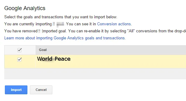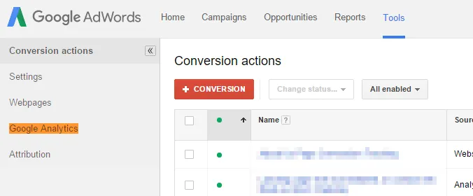 I’m glad you asked. Go to your AdWords Homepage and select the right campaign. Hit the “Tools” menu on top and choose “Conversions”. You want to import the conversion from Analytics, so choose “Google Analytics” as the source