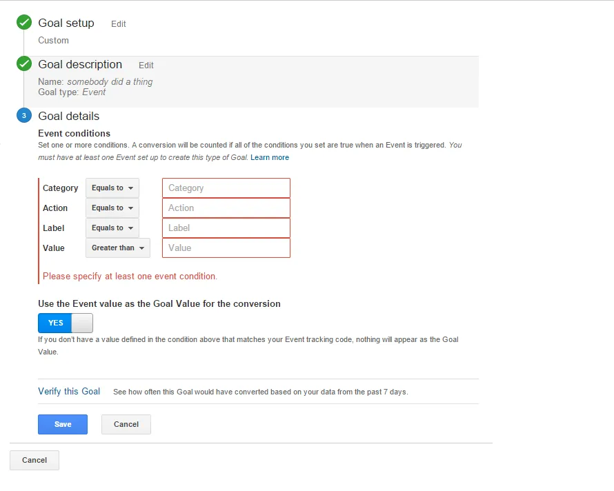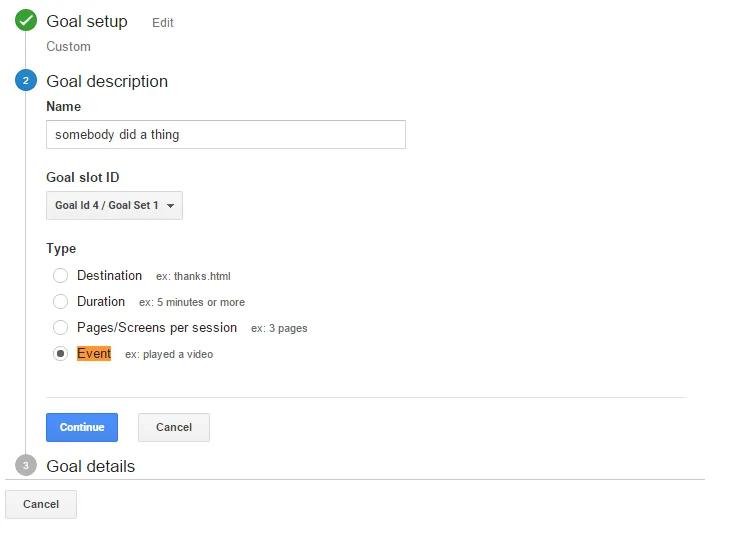 Here you want to make ABSOLUTELY SURE that your goal matches the event details you put in wayyy back when we were implementing the event tracking code on your page. Make sure the debug version of analytics is reporting the call, and make sure Google realtime analytics is reporting the same event details as well, just for good measure.
